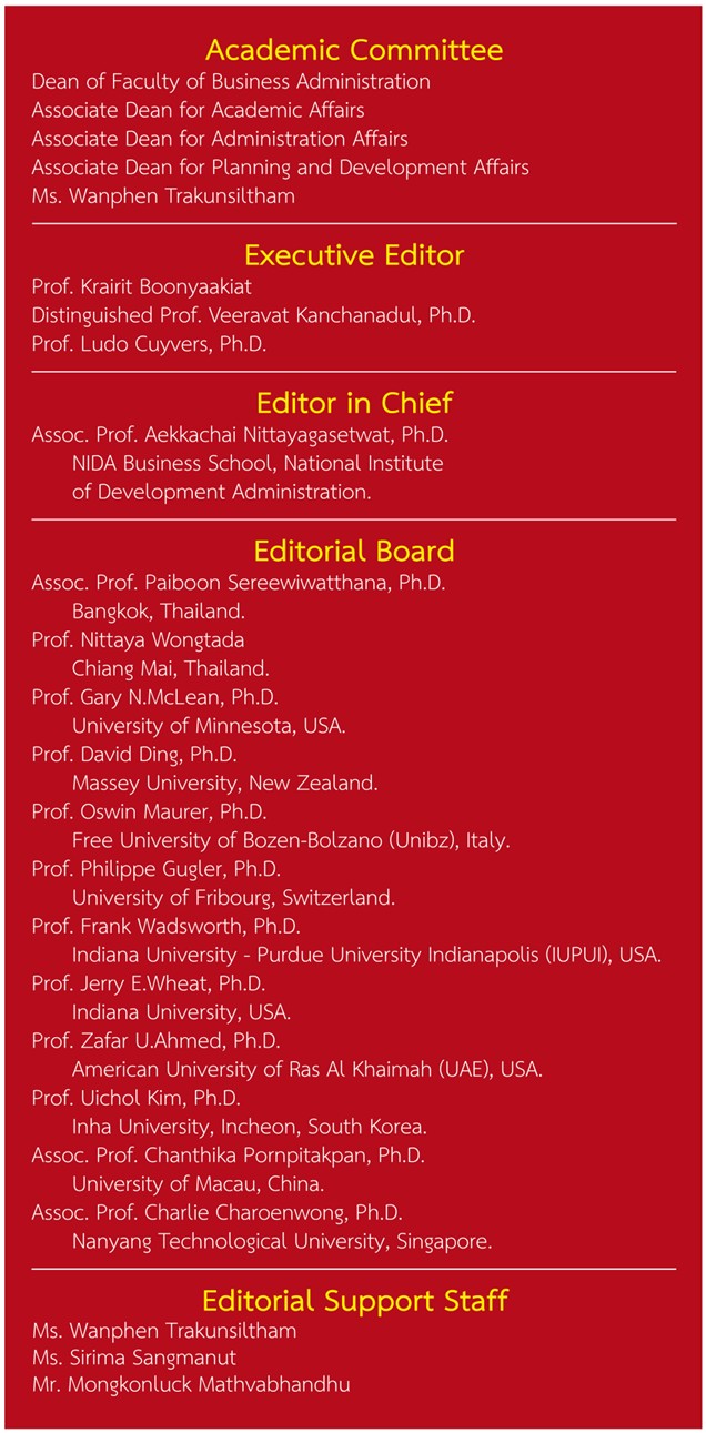 NIDA Business Journal (NBJ) is a double-blind peer-reviewed journal aiming at providing a national forum for effective communication of innovative research findings that contribute significantly to further the knowledge in business administration and its related field. Hence, the target audience consists of academicians, business administrators and practitioners, industrialists, researchers, students, and NIDA Graduate School of Business’s Alumni. The journal is published in paper format and also online & open access at www.nidabusinessschool.com อ่านเพิ่มเติม