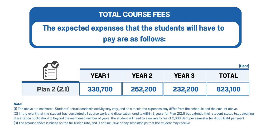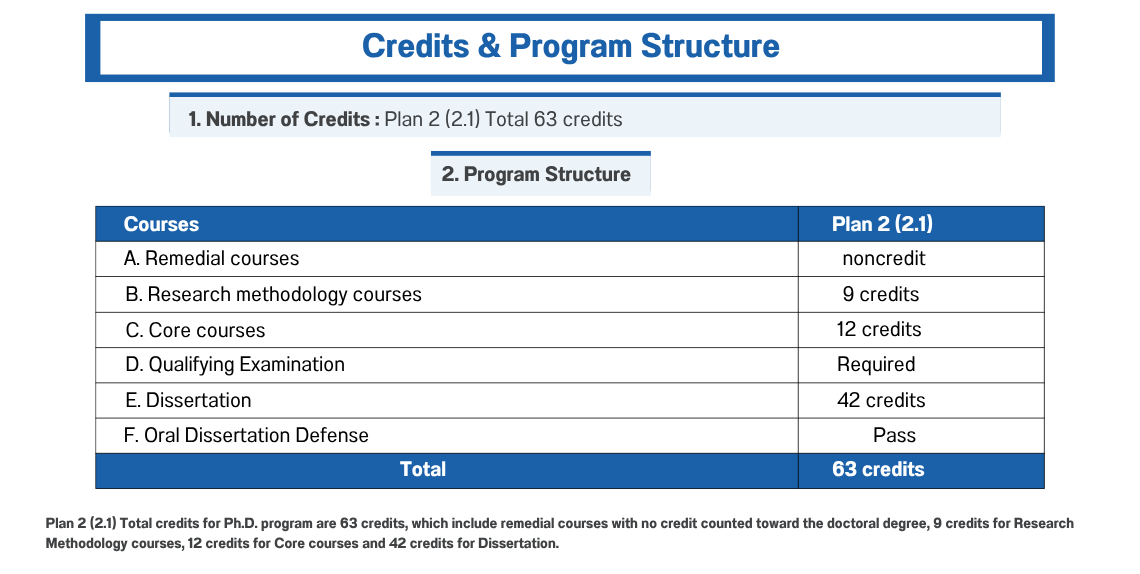 1. Plan 2 (2.1) for applicants who have a master’s degree, or a degree equivalent to a master’s degree or higher (i.e., Ph.D. degree in a non-business field) from a university or institution accredited by Ministry of Higher Education, Science, Research and Innovation (MHESI) (or organizations that provide approval for standards), and possesses an excellent scholastic record and background or has any other academic evidence that indicates an ability to perform successfully in the Program. Students will be required to take a total of 63 credits (21 credits of courses and 42 credits for dissertation).