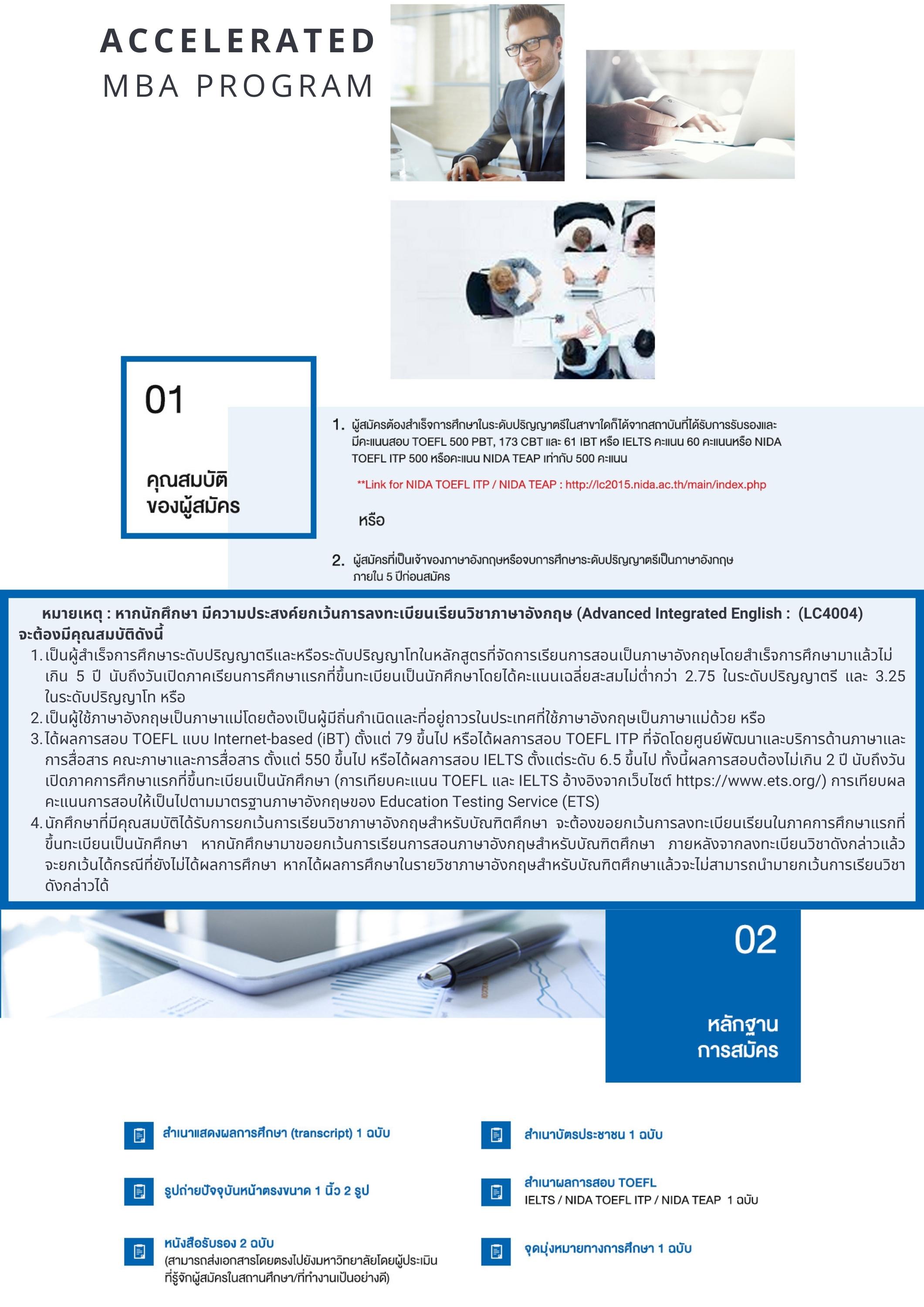 หลักสูตร Accelerated MBA (AMBA) ของสถาบันบัณฑิตพัฒนาบริหารศาสตร์ (นิด้า) ออกแบบมาสำหรับผู้ที่ต้องการศึกษาต่อปริญญาโท บริหารธุรกิจ ที่ต้องการเพิ่มศักยภาพในการบริหารทุกด้าน มีเป้าหมายเพื่อผลิตนักบริหารมืออาชีพยุคใหม่สู่สากล โดยมีการเรียนการสอนเป็นภาษาอังกฤษจากคณาจารย์ชั้นนำระดับประเทศ ดีกรีปริญญาเอกมากที่สุดในไทย