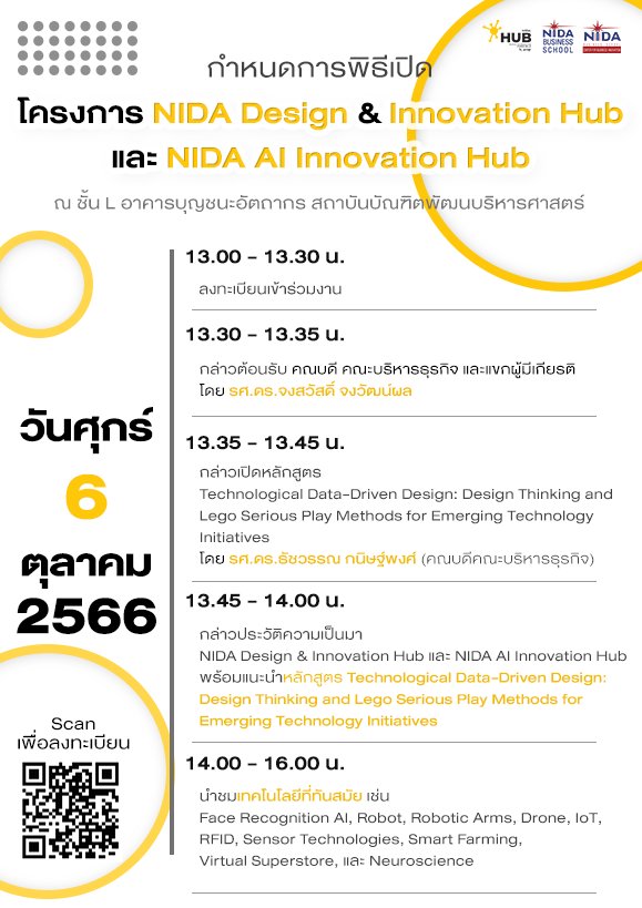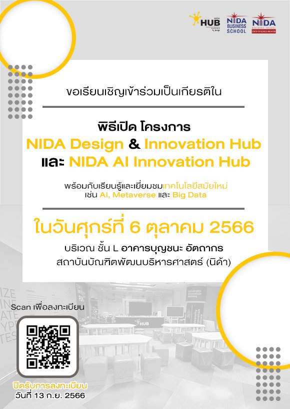 หน้าแรก ขอเรียนเชิญเข้าร่วมเป็นเกียรติในพิธีเปิดโครงการ NIDA Design & Innovation Hub และ NIDA AI Innovation Hub ขอเรียนเชิญเข้าร่วมเป็นเกียรติในพิธีเปิดโครงการ NIDA Design & Innovation Hub และ NIDA AI Innovation Hub