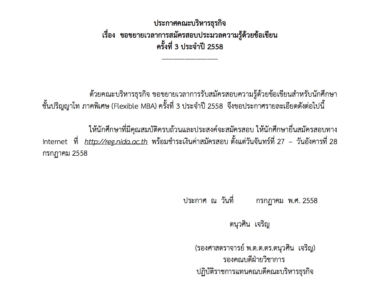 ประกาศคณะบริหารธุรกิจ เรื่อง ขอขยายเวลาการสมัครสอบประมวลความรู้ด้วยข้อเขียน ครั้งที่ 3 ประจำปี 2558