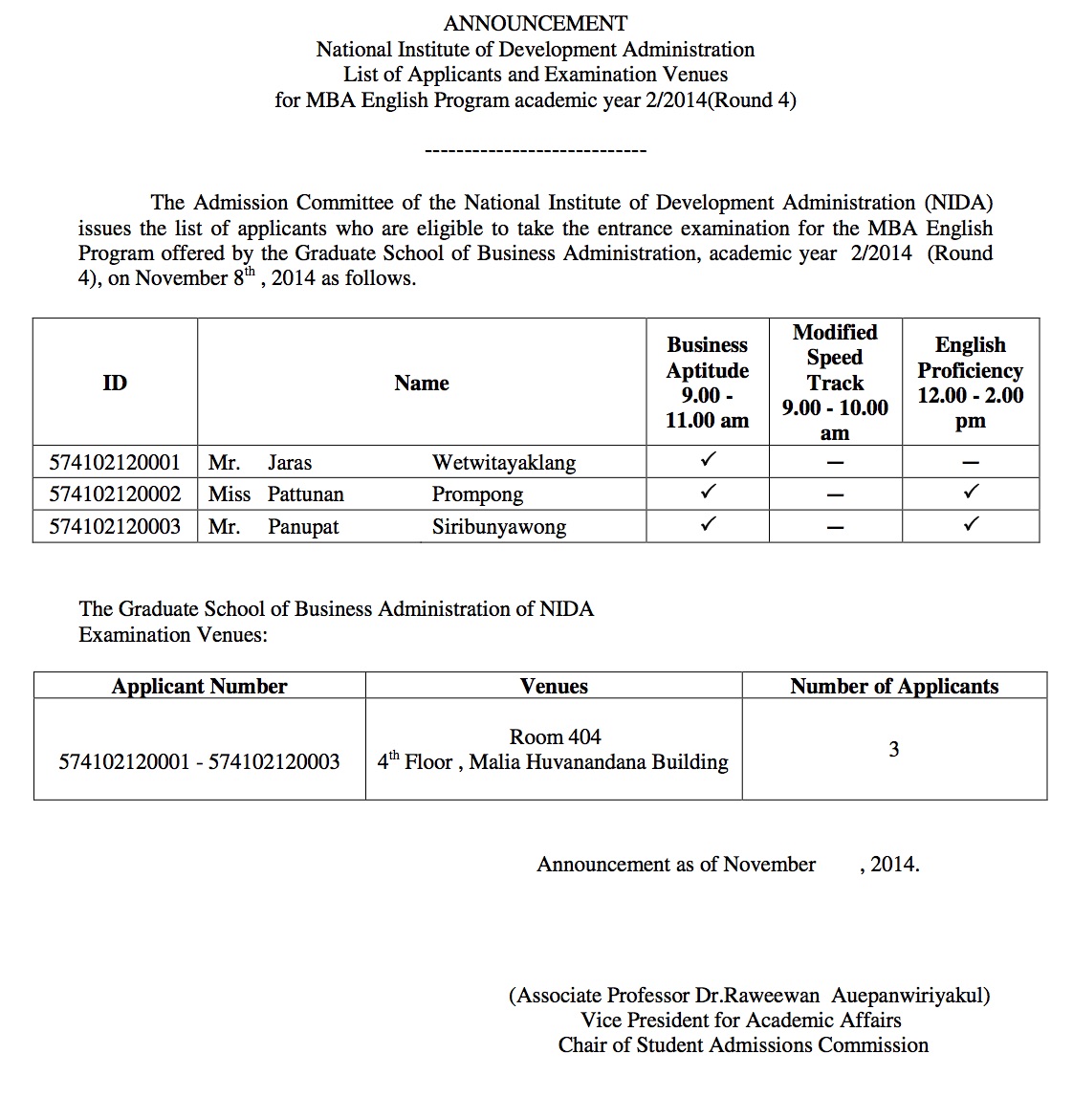 ANNOUNCEMENT: List of Applicants and Examination Venues for MBA English Program academic year 2/2014 (Round 4)