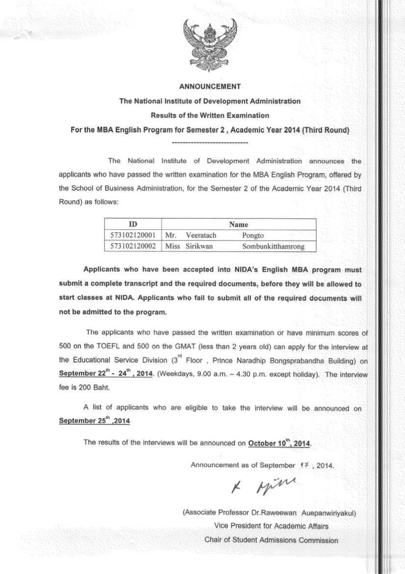 ANNOUNCEMENT : Results of the Written Examination For the MBA english Program for Semester 2, Academic Year 2014 (Third Round)