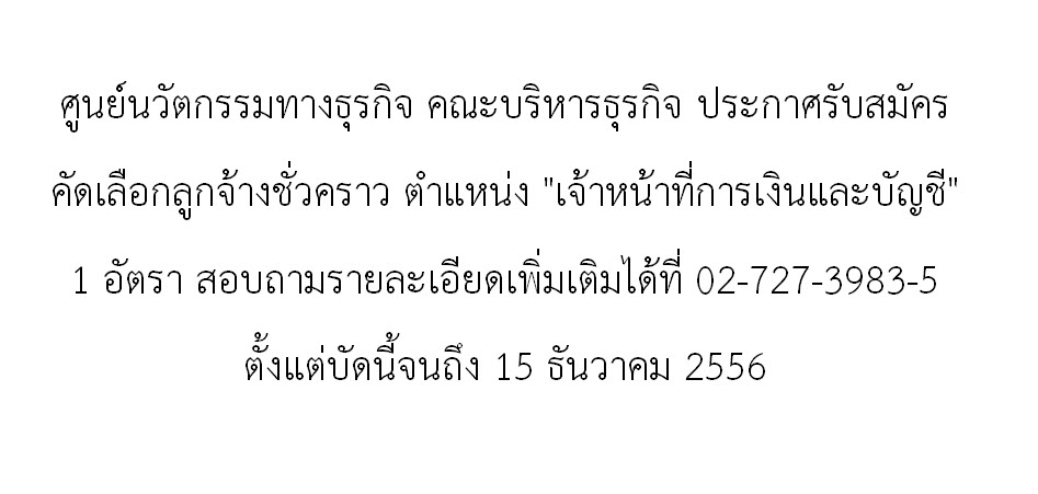หน้าแรก ศูนย์นวัตกรรมทางธุรกิจ คณะบริหารธุรกิจ ประกาศรับสมัครคัดเลือกลูกจ้างชั่วคราว ตำแหน่ง "เจ้าหน้าที่การเงินและบัญชี" 1 อัตรา สอบถามรายละเอียดเพิ่มเติมได้ที่ 02-727-3983-5 ตั้งแต่บัดนี้จนถึง 15 ธันวาคม 2556 ++ ศูนย์นวัตกรรมทางธุรกิจ คณะบริหารธุรกิจ ประกาศรับสมัครคัดเลือกลูกจ้างชั่วคราว ตำแหน่ง "เจ้าหน้าที่การเงินและบัญชี" 1 อัตรา สอบถามรายละเอียดเพิ่มเติมได้ที่ 02-727-3983-5 ตั้งแต่บัดนี้จนถึง 15 ธันวาคม 2556 สนใจ Download ใบสมัคร.... Document download NIDA-Application-form.doc http://nida.ali-orange.com/templates/images/default-nida.jpg แชร์