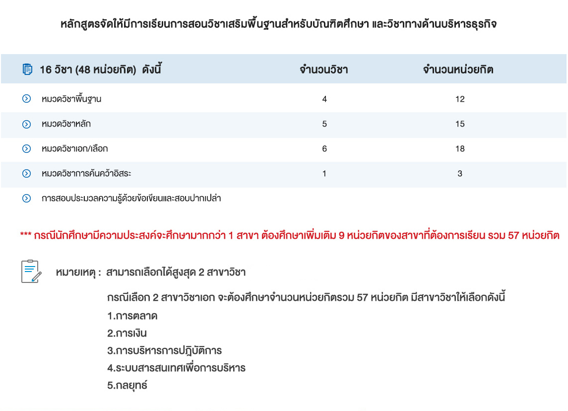 How ? : เหมาะสำหรับผู้ที่ต้องการเรียนสาขาวิชาเอก ตามความสนใจและการนำไปใช้งาน เพิ่มความเชี่ยวชาญ โดยเลือกเรียนวิชาเอกได้ การเงิน การตลาด การบริหารการปฏิบัติการ ระบบสารสนเทศเพื่อการบริหารและ Double Majors