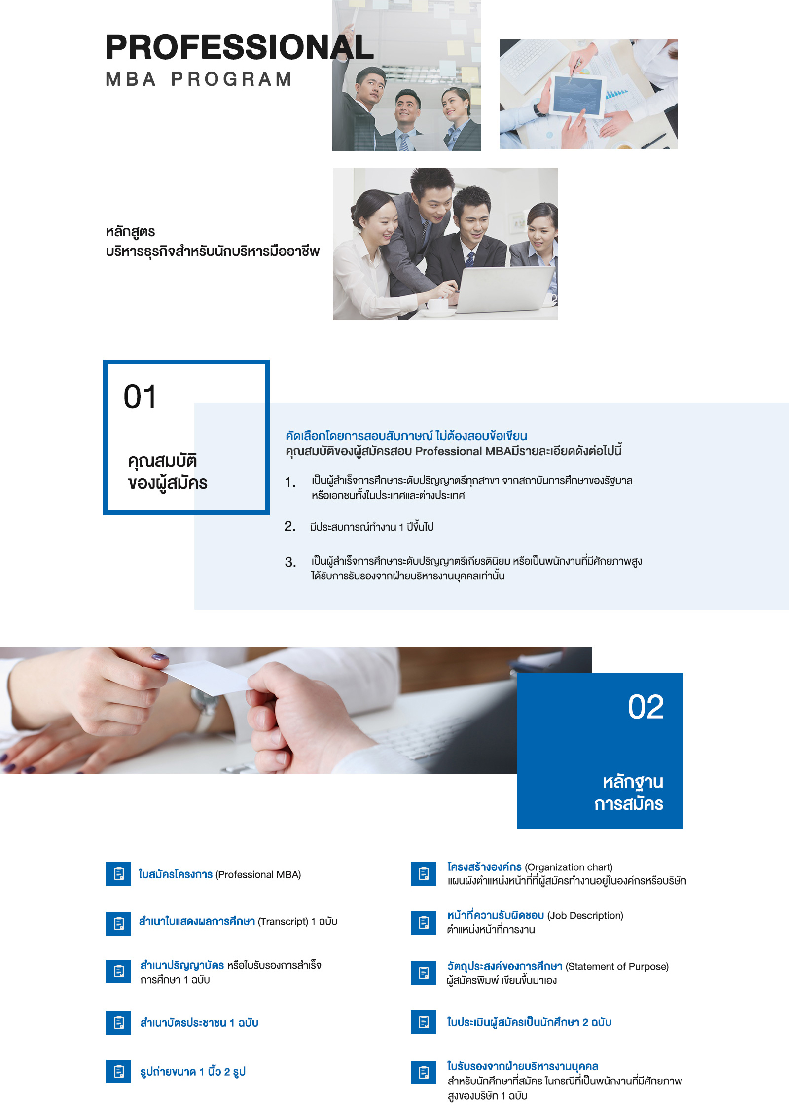 หลักสูตรบริหารธุรกิจมหาบัณฑิต คณะบริหารธุรกิจ สถาบันบัณฑิตพัฒนบริหารศาสตร์ เป็นหลักสูตรที่มุ่งผลิตบัณฑิตให้มีความรู้ความเข้าใจ ทางด้านบริหารธุรกิจมุ่งความเป็นเลิศทางวิชาการ ด้วยการสร้างผู้นำธุรกิจและนักบริหารที่มีความรู้ความสามารถและทักษะในระดับสากล ตลอดจนเพื่อเป็นการรองรับและมุ่งพัฒนาคนและการศึกษาให้ก้าวสู่กลุ่มประเทศ ประชาคมเศรษฐกิจอาเซียน (Asean Economic Community หรือ AEC) ดังนั้นคณะบริหารธุรกิจจึงเล็งเห็นความสำคัญและประโยชน์ที่จะเปิดโครงการใหม่ๆ ในหลักสูตร MBA จึงจัดตั้งโครงการปริญญาโททางบริหารธุรกิจ สำหรับผู้เชี่ยวชาญ/มืออาชีพ (Professional MBA Program)
